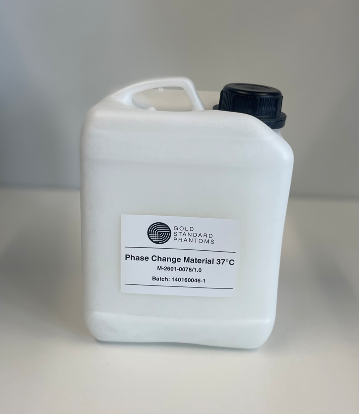 The Phase Change Material supplied as part of the Temperature Control Bundle is an organic, wax-like material that has a melting/solidifcation temperature of approximately 37 °C, during which it absorbs/released a large quantity of latent heat due to it changes from solid to liquid and vice versa. By filling the main chamber of a phantom with this material, the temperature of the phantom can be maintained at close to body temperature for many hours. Given that many MRI observable phenomena are temperature dependent, this enables their assessment under controlled conditions. These phenomena include: